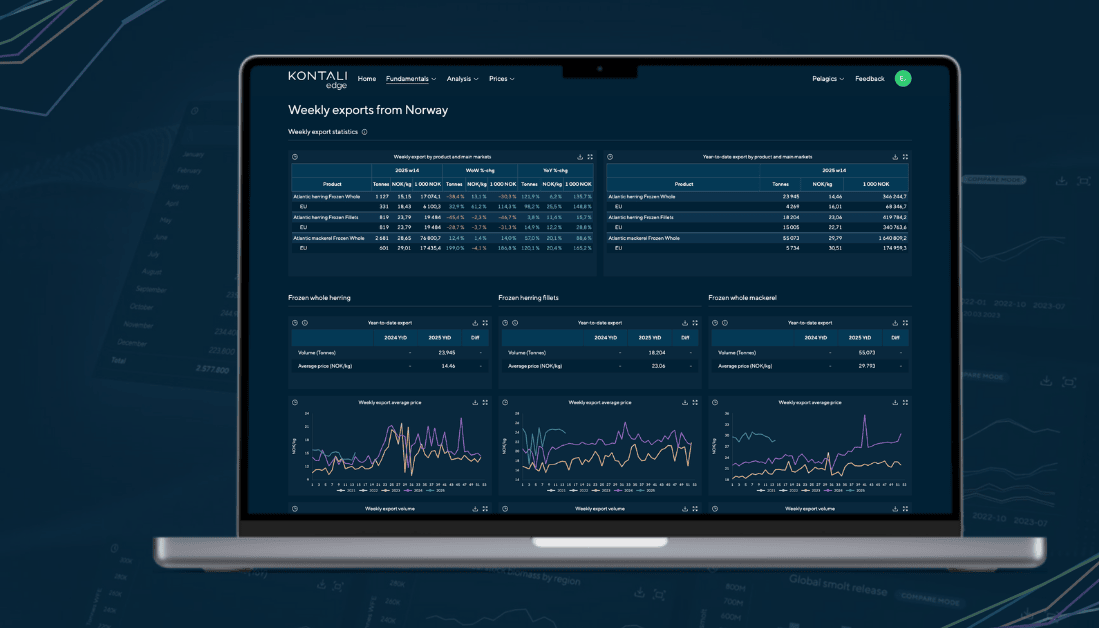 ▪ It’s a dedicated section in Kontali Edge with live data and insights on small pelagic species like herring, mackerel, blue whiting, and related feed ingredients.