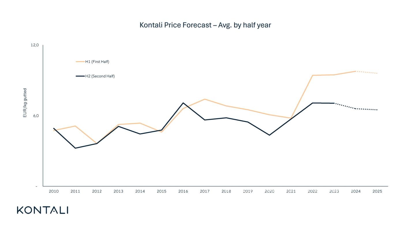 “Farmed salmon has become a very popular food staple, but salmon prices downstream in the supply chain must remain competitive against beef, pork, and poultry. Looking ahead, supply in the first half of the year is expected to once again face a seasonal shortage. In the second half of the year, as supply improves, a stronger focus on retail promotions and campaigns is expected. As production picks up, promotional activities and contracts will nevertheless not balance out the excess volumes in the spot market at ‘spring prices,’ so a notable price drop is forecasted,” says Lars Daniel Garshol, Lead Analyst, Salmonids at Kontali.